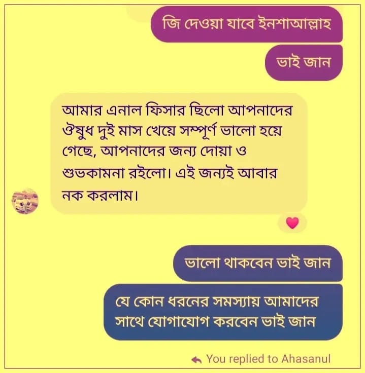 জ্বী, উপরওয়ালার উপর বিশ্বাস রাখুন। তিনিই রোগ দিয়েছেন,তিনিই সুস্থ করবেন। আমরা শুধু একটি মাধ্যম। আমাদের প্রোডাক্ট গ্রহণ করলে এবং তা উপরওয়ালার নিয়ামত মনে করলে ইনশাআল্লাহ আপনি সুস্থ হবেন।