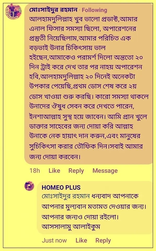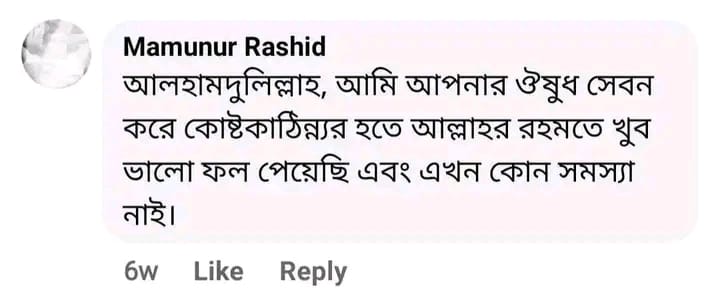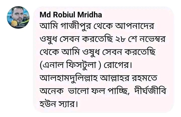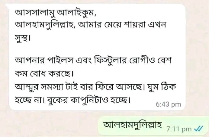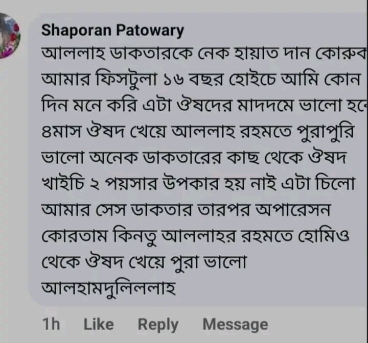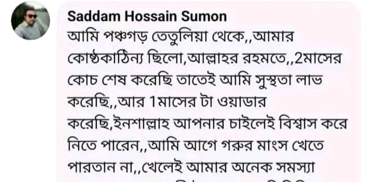 গত ১১ বছরে আমাদের প্রোডাক্ট লক্ষাধিক রোগীকে সুস্থ করেছে। সাবেক তথ্য সচিব, ক্রীড়া প্রতিমন্ত্রী, ইসলামী ব্যাংকের MD, নুসরাত ফারিয়ার মা এবং ক্রিকেটার সাব্বির রহমানের বাবার মতো বিশিষ্টজনেরা আমাদের ওষুধ ব্যবহার করে সুস্থ হয়েছেন।আপনি কেন হবেন না?